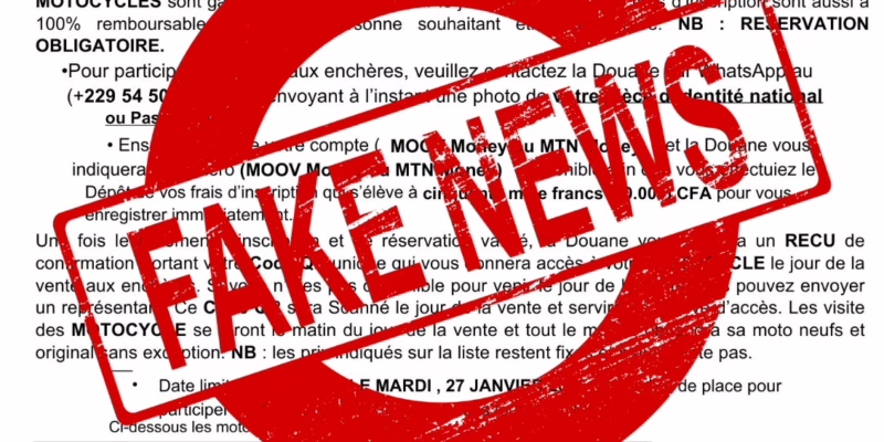 Un communiqué circulant abondamment sur les réseaux sociaux, notamment sur Facebook, annonce une prétendue vente aux enchères de motos neuves organisée par la Direction Générale des Douanes du Bénin, sous l’autorité de sa Directrice Générale, Madame Adidjatou Hassan Zanouvi. Après vérifications, il s’agit d’une fausse information. Le message en question évoque une vente programmée … Lire la suite de Arnaque au Bénin : Alerte! Une fausse vente aux enchères de motos attribuée à la Douane béninoise