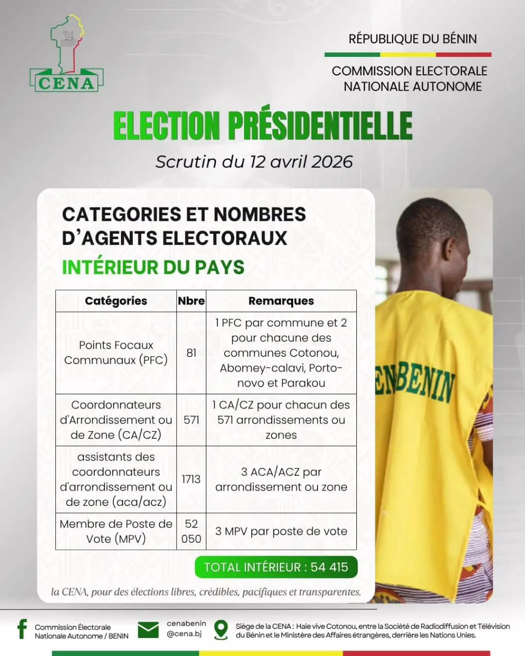 La Commission électorale nationale autonome (CENA) a dévoilé les chiffres officiels du scrutin présidentiel qui aura lieu le 12 avril 2026. Au total, 7 897 287 électeurs sont attendus dans 17 350 postes de vote à travers le pays.