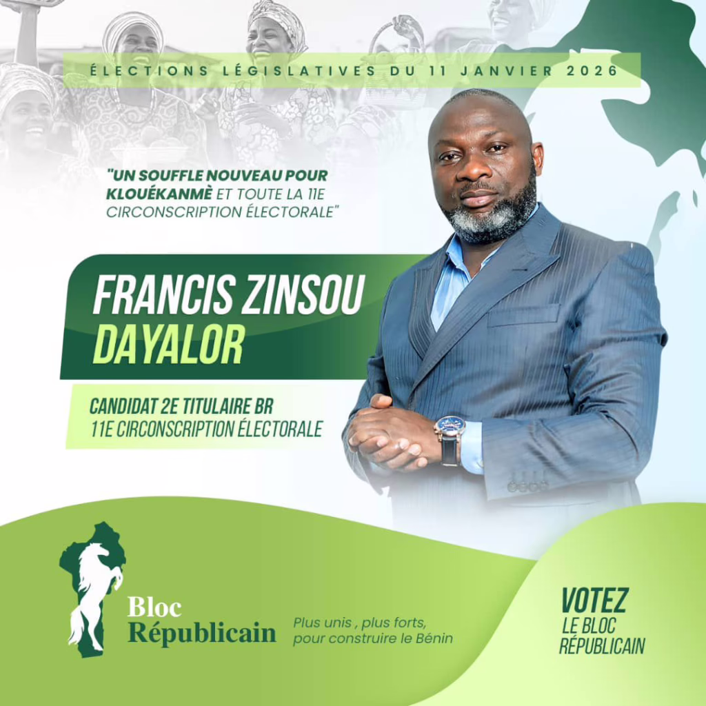 Pour une première fois, le Bloc Républicain remporte trois sièges dans les 11è et 12è circonscriptions électorales aux législatives Aux communales du 11 janvier 2026, le parti a raflé la majorité des sièges des conseillers communaux. Ce qui lui vaut cinq mairies sur les six que compte le département du Couffo. 2ème titulaire du BR dans la 11ème Circonscription électorale ( Aplahoué, Klouékanmey, Djakotomey) l’opérateur économique Zinsou Francis Dayalor aura été l’homme qui a apporté du sang neuf au parti dans le Couffo, en général, et dans la 11è, en particulier.