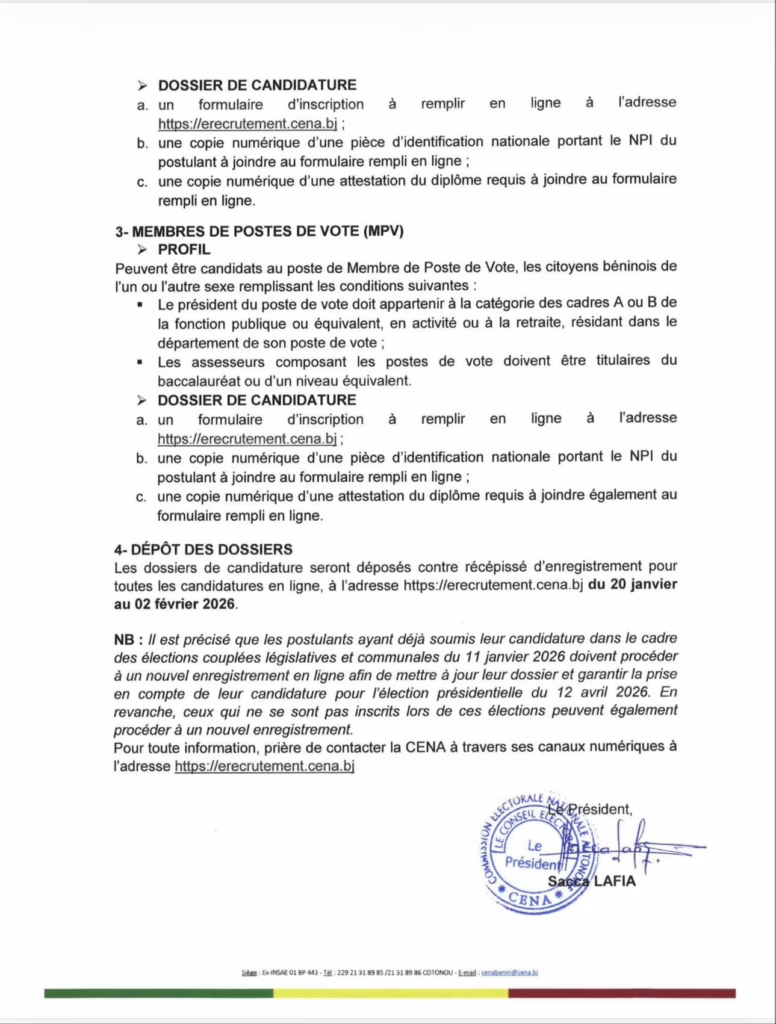 Dans le cadre des élections présidentielles du 12 avril 2026, la Commission électorale nationale autonome (CENA) lance un appel à candidature en vue du recrutement des coordonnateurs d’arrondissement ( CA) ou de zone ( CZ),  des assistants de coordonnateur d’arrondissement ( ACA) ou de zone ( ACZ) et des membres de poste de vote ( MPV). Les dossiers de candidature seront déposés en ligne à l’adresse  https://erecrutement.cena.bj contre récépissé du 20 janvier au 2 février 2026.