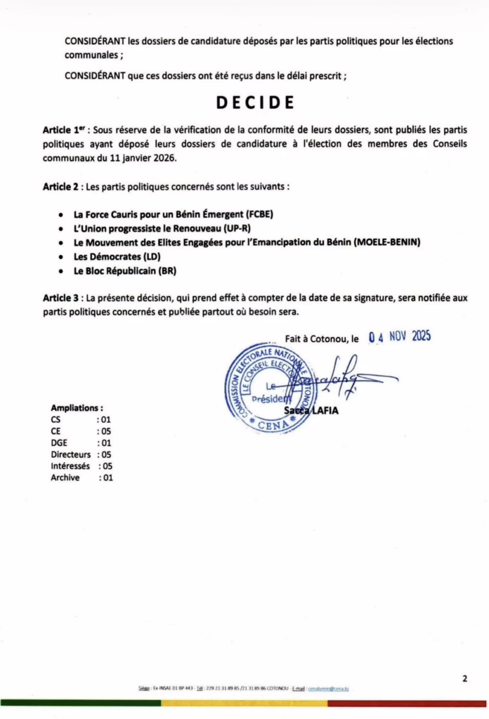 Par décision en date du 4 novembre 2025, le président de la CENA a publié la liste des partis politiques déclarés pour les élections communales du 11 janvier 2026.