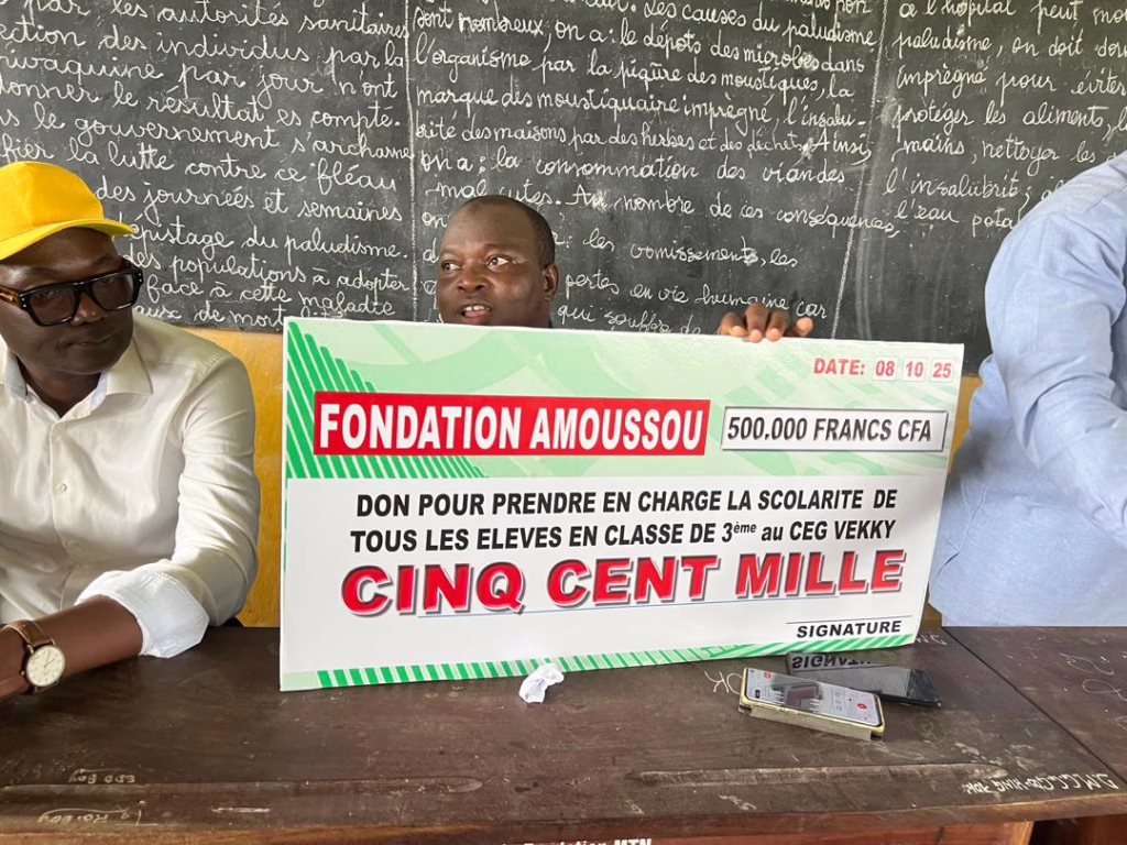 Une délégation de la Fondation « Amoussou » conduite par Dr Imam Chakirou Amoussou était au CEG Vekky dans la commune de Sô-Ava ce mercredi 08 octobre 2025 pour un geste capital. Il s’agit de la remise officielle d’une enveloppe financière de 500.000fcfa pour soutenir la scolarité des candidats au Bepc.