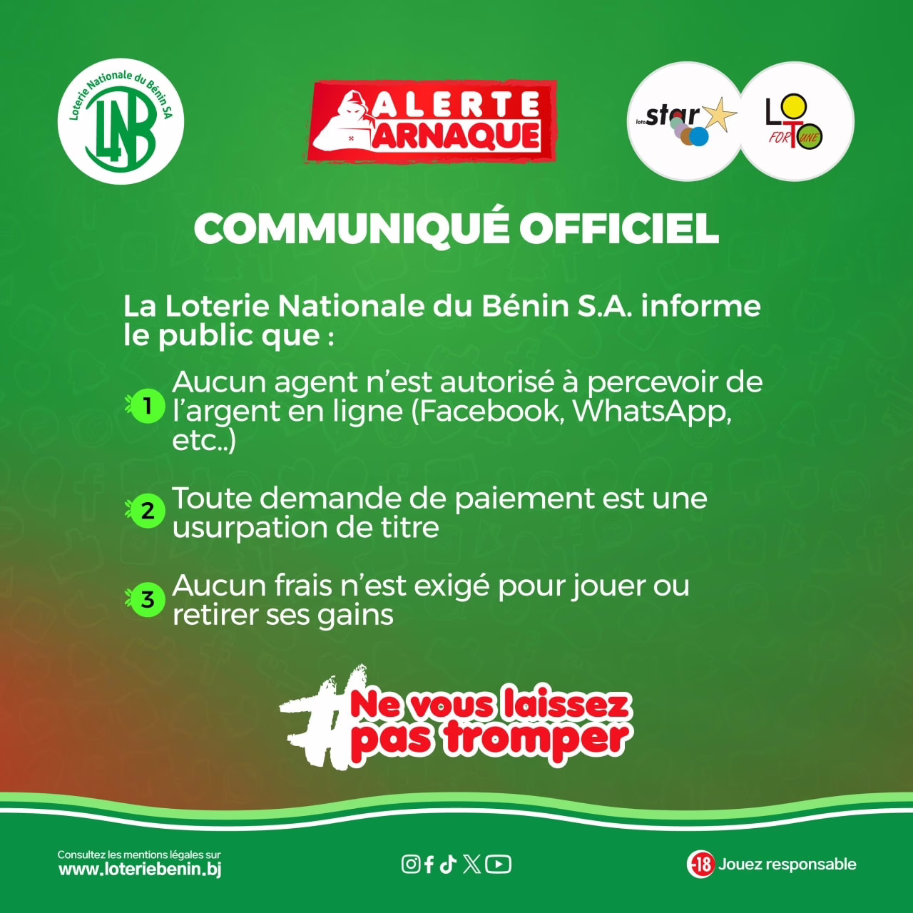 La Loterie Nationale du Bénin S.A. met en garde le public contre les tentatives d’arnaque en ligne. « Aucun agent de la LNB S.A. n’est autorisé à demander de l’argent sur Facebook, WhatsApp ou tout autre canal en ligne. Toute demande de paiement constitue une usurpation de titre. Aucun frais n’est exigé pour jouer ou retirer ses gains. Lire le communiqué.