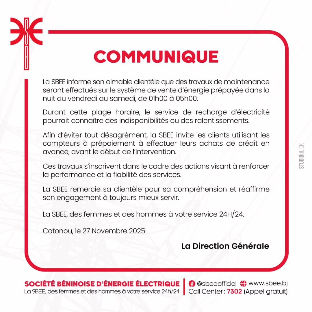 Au Bénin, la Société Béninoise d’Énergie Électrique (SBEE) informe sa clientèle qu’une opération de maintenance sera réalisée sur le système de vente d’énergie prépayée dans la nuit du vendredi au samedi, entre 01H 00 et 05H 00.