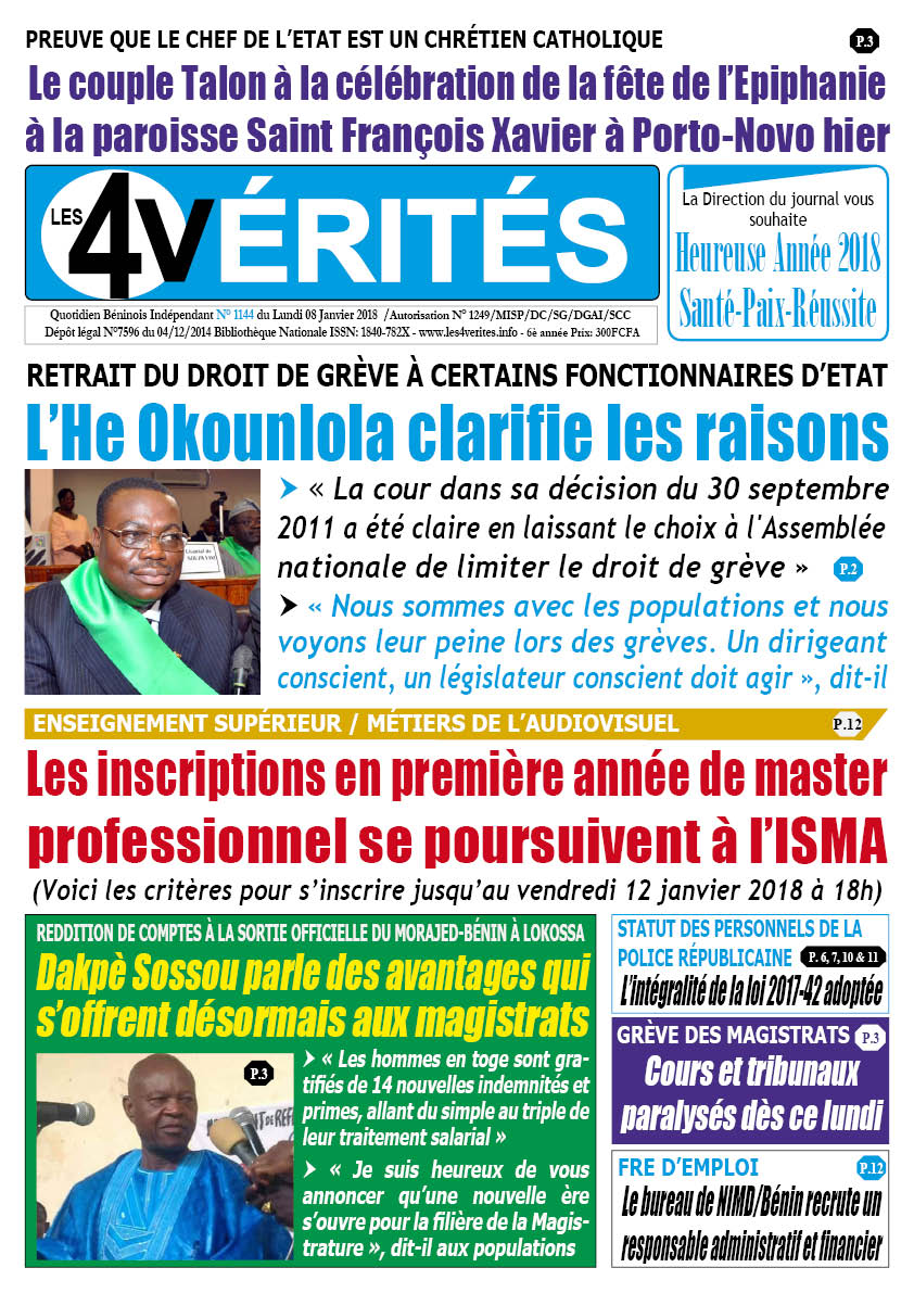 La Une du lundi 8 janvier 2018