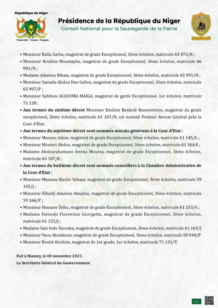 Au Niger, le général Tiani qui est au pouvoir depuis le 26 juillet, date du coup d’Etat contre Mohamed Bazoum, vient de procéder à une série de nominations. A travers de nouveaux décrets signés, plusieurs acteurs de la justice ont été promus. Il faut souligner que les nominations ont été faites au sein de la Chambre judiciaire et la Chambre administrative de la Cour d’Etat entre autres. Ci-dessous, liste des nominations