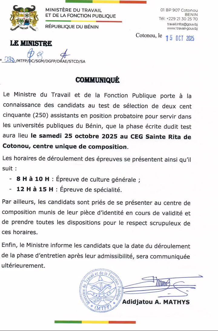 Au Bénin, le ministre du Travail et de la Fonction publique porte à la connaissance des candidats au test de sélection de 250 assistants en position probatoire pour servir dans les Universités publiques du Bénin que la phase écrite dudit test aura lieu le samedi 25 octobre 2025 au CEG Ste Rita de Cotonou , centre unique de composition. Le ministre informe que la date de déroulement d’entretien