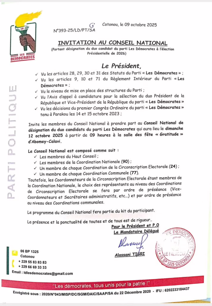 Dans un document ( ci-dessous) daté du 09 octobre 2025 et signé par Alassane Tigri, mandaté par le président du parti, et portant désignation du duo candidat du parti Les Démocrates à l’élection Présidentielle de 2026, le parti invite les membres du Conseil National à prendre part au Conseil National de désignation du duo candidats du parti Les Démocrates qui aura lieu le dimanche 12 octobre 2025 à partir de 09 heures à la salle des fête « Gratitude» d’Abomey-Calavi.