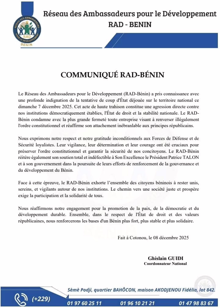 Dans un communiqué en date du 8 décembre signé par son coordonnateur national, Ghislain Guidi, le Réseau des Ambassadeurs du Bénin ( RAD-Bénin) fustige la tentative de putsch au Bénin le 7 décembre 2025. Par ailleurs, le Réseau annonce un gigantesque meeting samedi prochain à Cotonou.