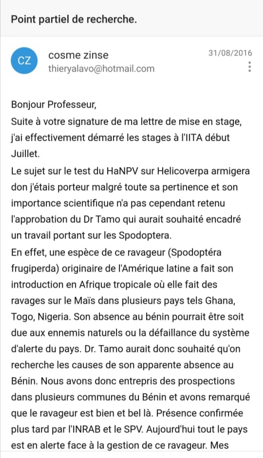 Voici ci dessous en image, l’e-mail que ZINSE Cosme a envoyé en août 2016 au Professeur Alavo ainsi que sa réponse immédiate.