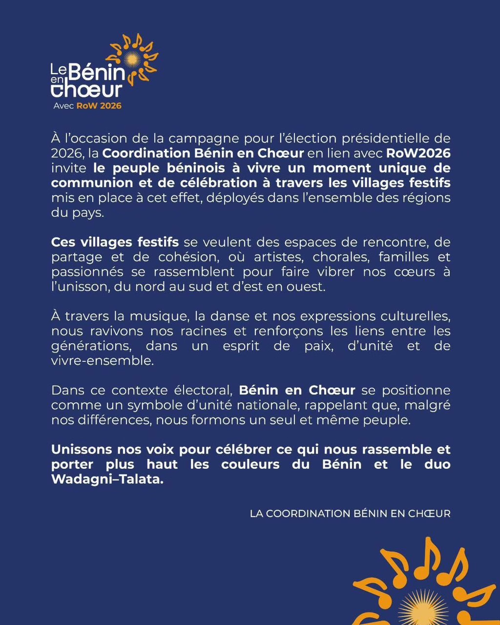 A travers la musique, la danse et nos expressions culturelles, précise le promoteur Ulrich Adjovi, « nous ravivons nos racines et renforçons les liens entre les générations , dans un esprit de paix, d’unité et de vivre ensemble. Dans ce contexte électoral, Bénin en chœur se positionne comme une plateforme symbole d’unité nationale , rappelant que malgré nos différences , nous formons un seul et même peuple ». C’est pourquoi le PDG Ulrich Adjovi exhorte les uns et les autres à fédérer les synergies pour célébrer ce qui nous rassemble et porter plus haut les couleurs du Bénin et le duo Wadagni Talata le 12 avril 2026.
